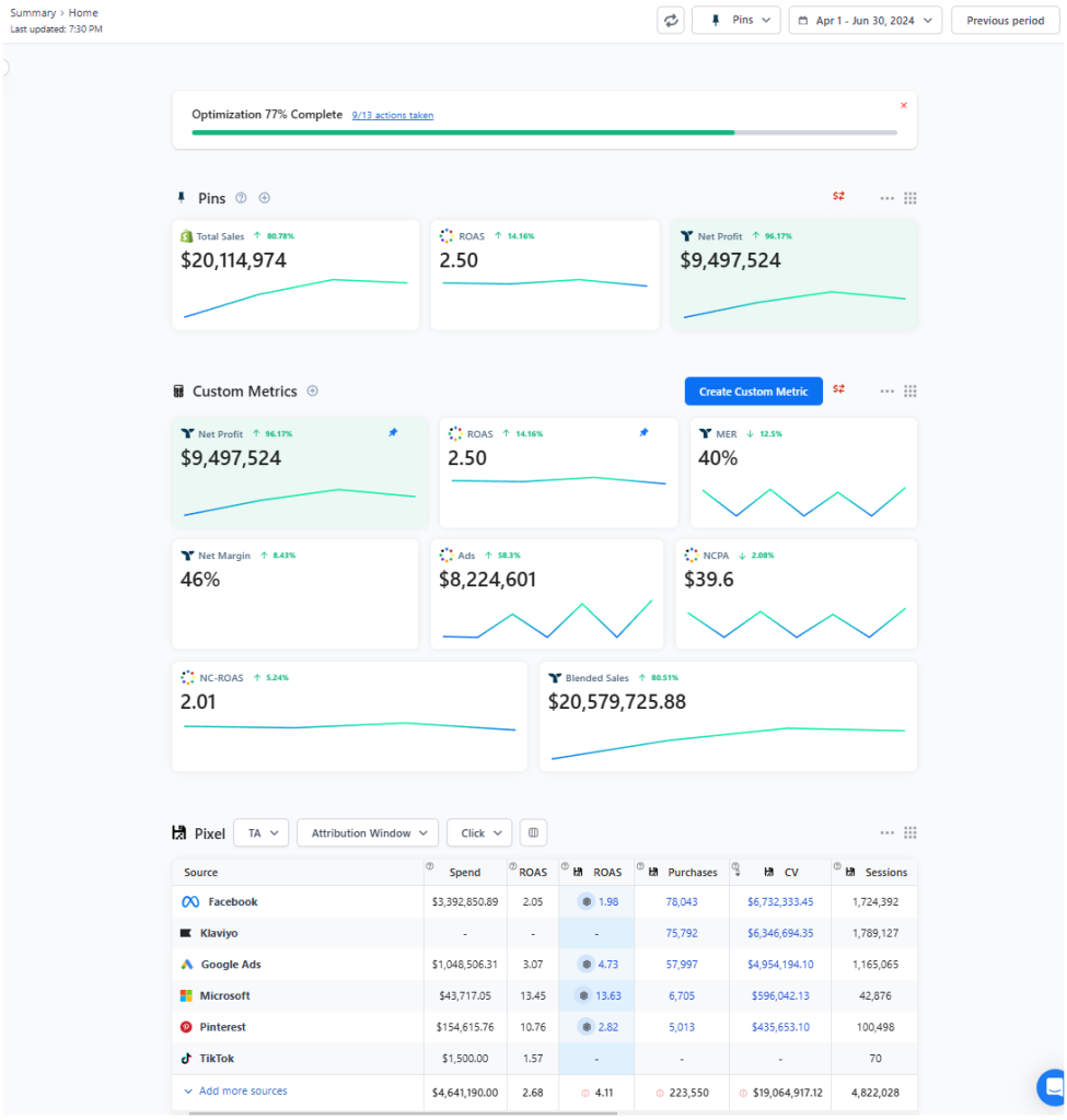To guide the rebuild, we created a deep-dive report that combined on-site and paid social signals. We analyzed landing page conversion rates and key Facebook metrics by product line—hook rate, unique outbound CTR, and conversion rate—then cross-referenced those findings with Google Ads performance. This allowed us to identify “hidden potential” products and restructure campaigns so more budget flowed to the SKUs with the strongest upside.